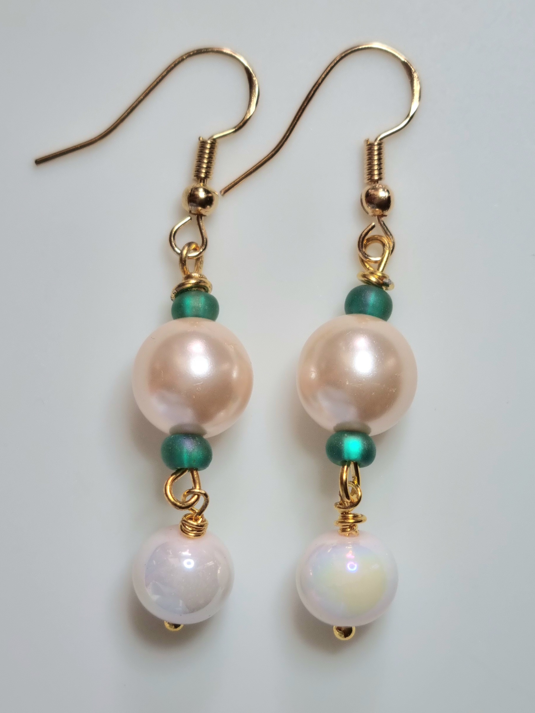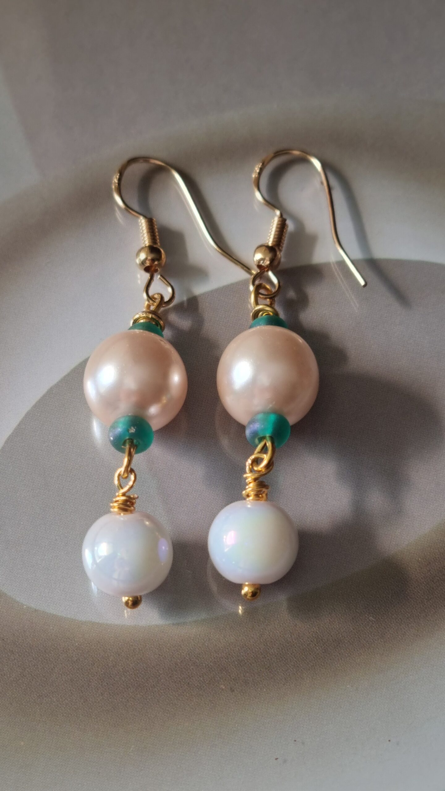 | Pink Pearl and White Glass stone drop earrings adorned with a 4mm green stone |